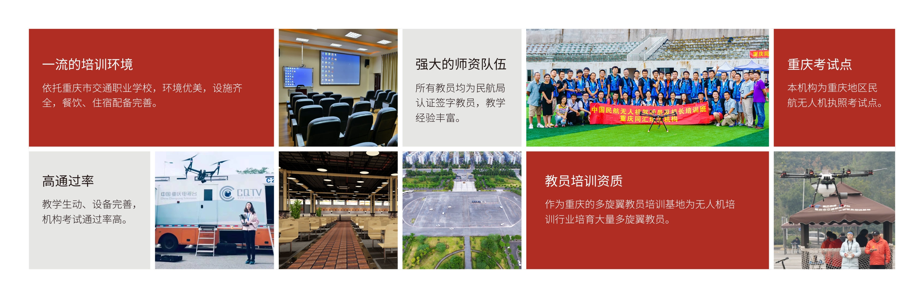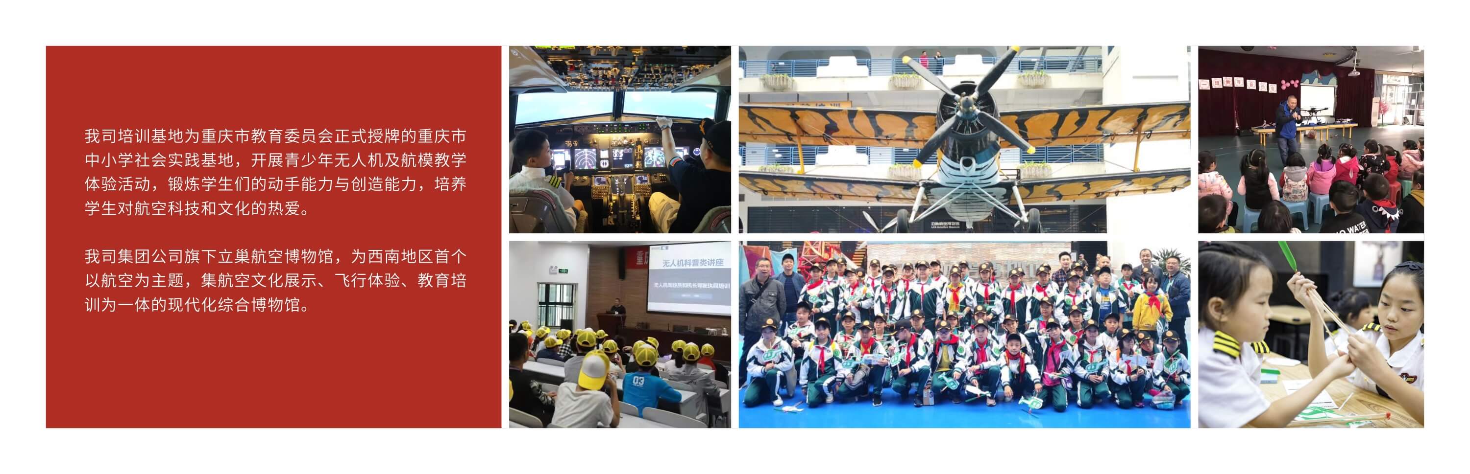 集團旗下重慶同匯通用航空有限公司,成立于2014年,是中國優秀的無人機綜合應用技術服務商。為政府、企事業單位、社會團體、院校、個人等提供無人機培訓、產品及服務。 作為重慶第一家無人機培訓機構,是重慶地區民航局無人機操控員執照考試中心,承擔重慶地區各無人機培訓機構的考試任務。 公司開展民航局無人機操控員執照培訓,為重慶多家無人機使用單位提供無人機操控員的培訓取證等 業務,累計培訓102期,3700余名學員。公司同匯成立慧飛重慶兩江分校,曾獲2022年慧飛航拍比賽十佳航拍分 ,開展慧飛(UTC)無人機航拍、測繪、應急消防、運載技術和定制化課程,累計培訓300余期,3400余名學員 。 發展中的同匯,將遵循立巢集團“誠信公正、務實創新擔責精業、為善致遠”的企業文化,不斷進取、開拓創新,專注于無人機與航空文化教育,以精湛的技術和優質的教學,竭誠為廣大學員和用戶提供服務,為促進無人機行業健康發展做出貢獻!